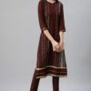 Brown color foil print polyester rayon kurta has round neck,three quarter sleeve,side slit and straight hem.Brown Color Dyed polyester rayon pant with elasticated back slip on style.