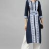 Navy Blue Color Digital Printed Polyester Rayon kurta has Round neck,three quarter sleeves,side slit and straight hem.White color dyed polyester rayon palazzo with elasticated back slip on style.
